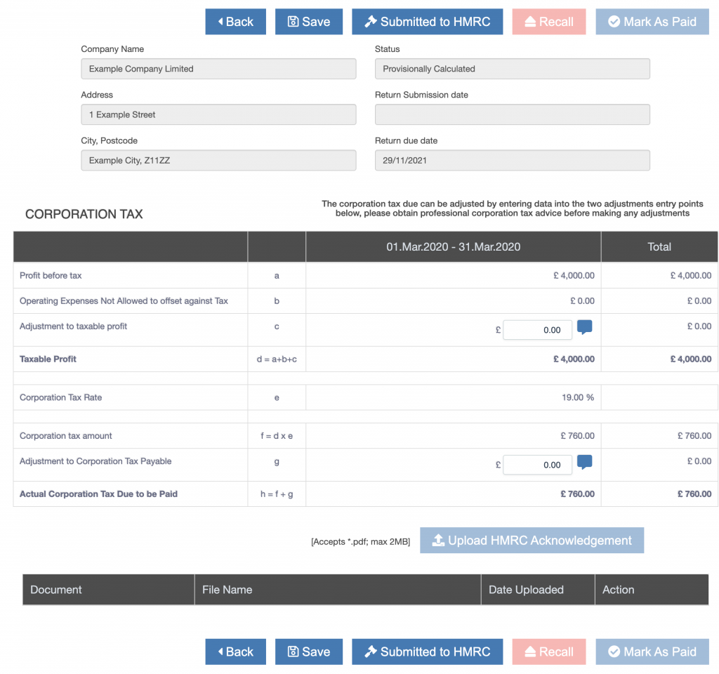 Corporation tax is automatically populated from the other entries made into ZotaBooks, the income less allowable expenses is the taxable profit which then has the prevailing corporation tax rate applied.