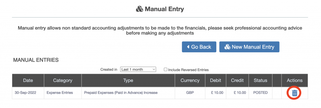 Navigate to the “Manual Entry” screen (click here to learn how to navigate to the screen). The “Manual Entry” screen is displayed. The list of accounting adjustments (manual entries) is displayed, each entry which has not been reversed will have a reverse icon under the Actions heading (trash can, circled in red) and the status will say posted.