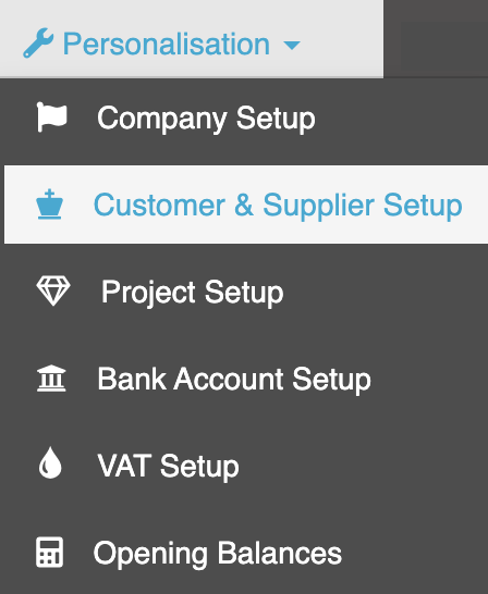 To add a new customer, goto Personalisation -> Customer & Supplier Setup