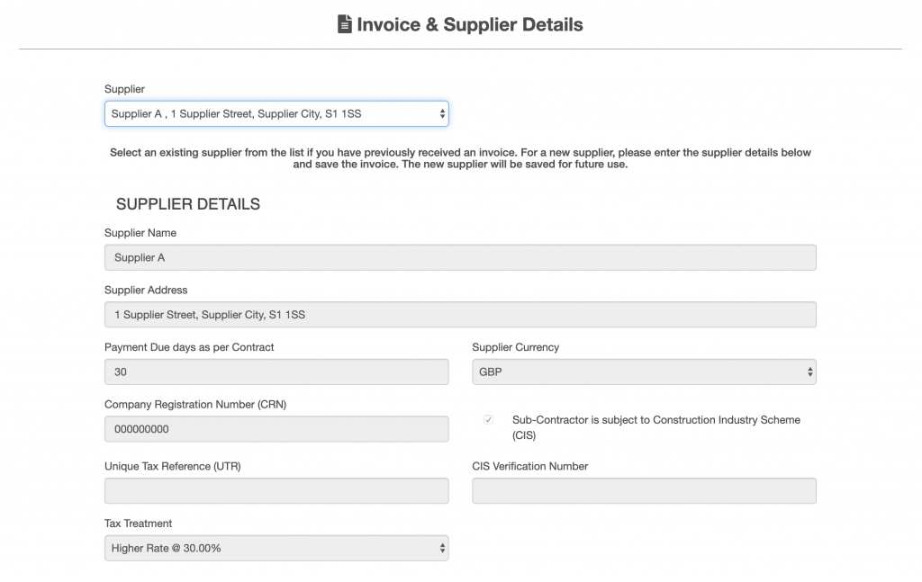 Enter the invoice details, additional data items are required for an invoice received which is subject to CIS.