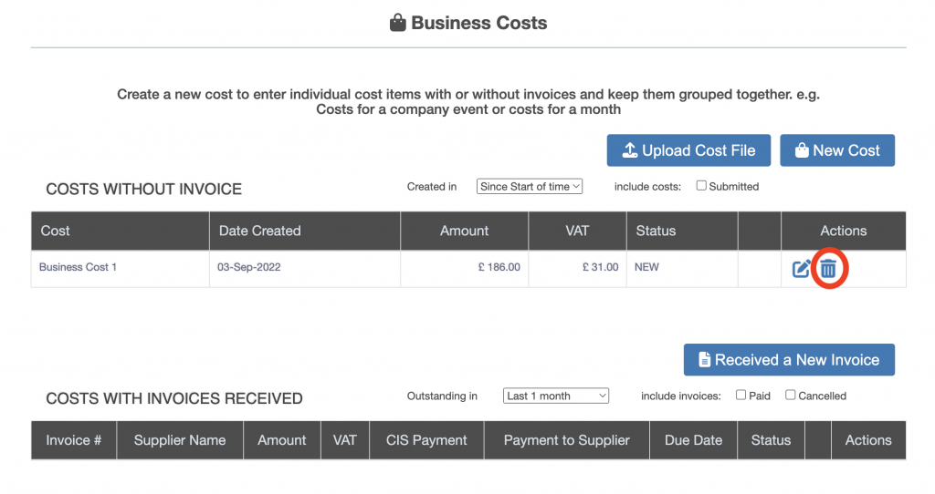 To delete a business cost claim, show the list of cost claims. A business cost claim can be deleted by selecting the trash can icon (circled in red below).