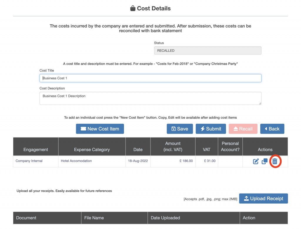 A cost entry can be deleted when the business cost claim has not been submitted. To delete a business cost claim, open the business cost claim then click on the trash can icon (circled in red below).