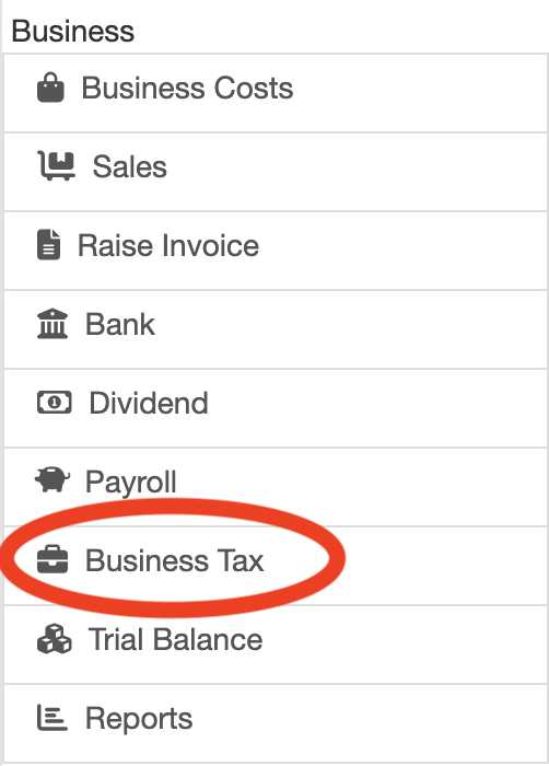 From the left hand menu select “Business Tax” under “Business” (outlined below in red).