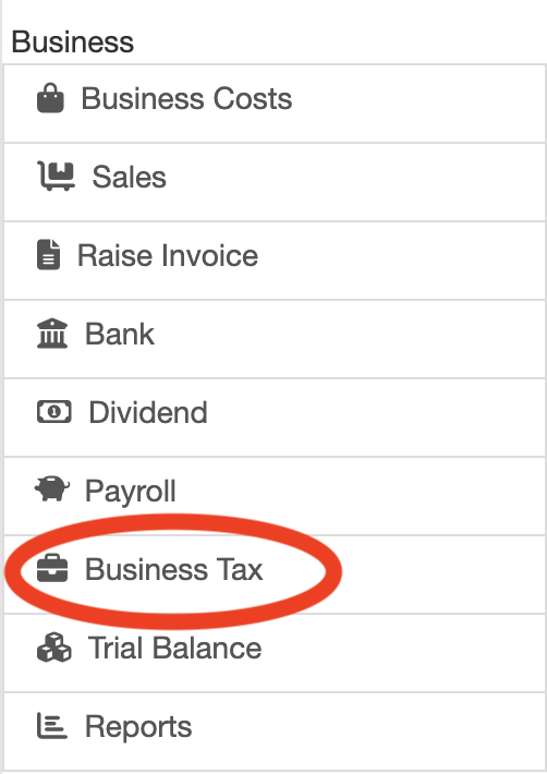 From the left hand menu select “Business Tax” under “Business” (outlined below).