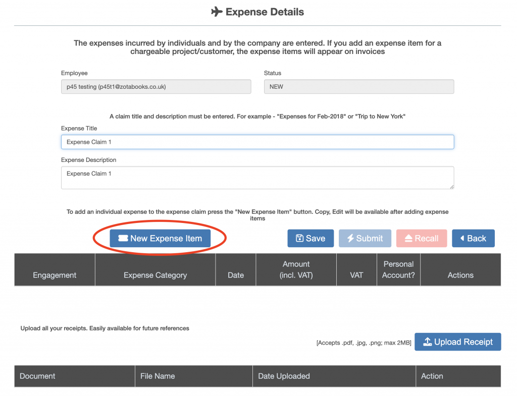 As many expense entries as required can be added to one expense claim. Repeat the process from pressing the “New Expense Item” button to add more expense entries to the expense claim.
