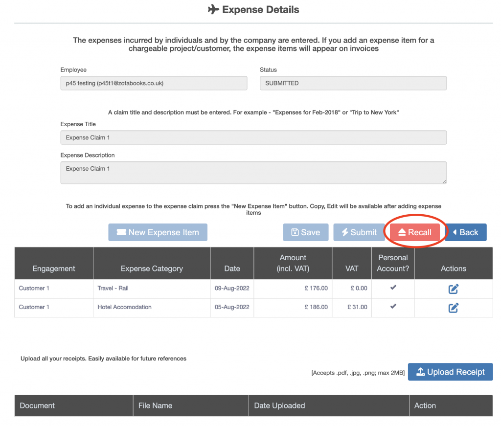 Once an expense claim has been submitted the expense claim is no longer editable. A submitted expense claim can be withdrawn from submission (recalled) where: