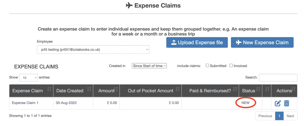 Click on “Expense Claim” from the left hand menu, the expense application is displayed and the list of expense claims which can be edited is displayed. Expense claims with a status of “New” or “” can be edited.