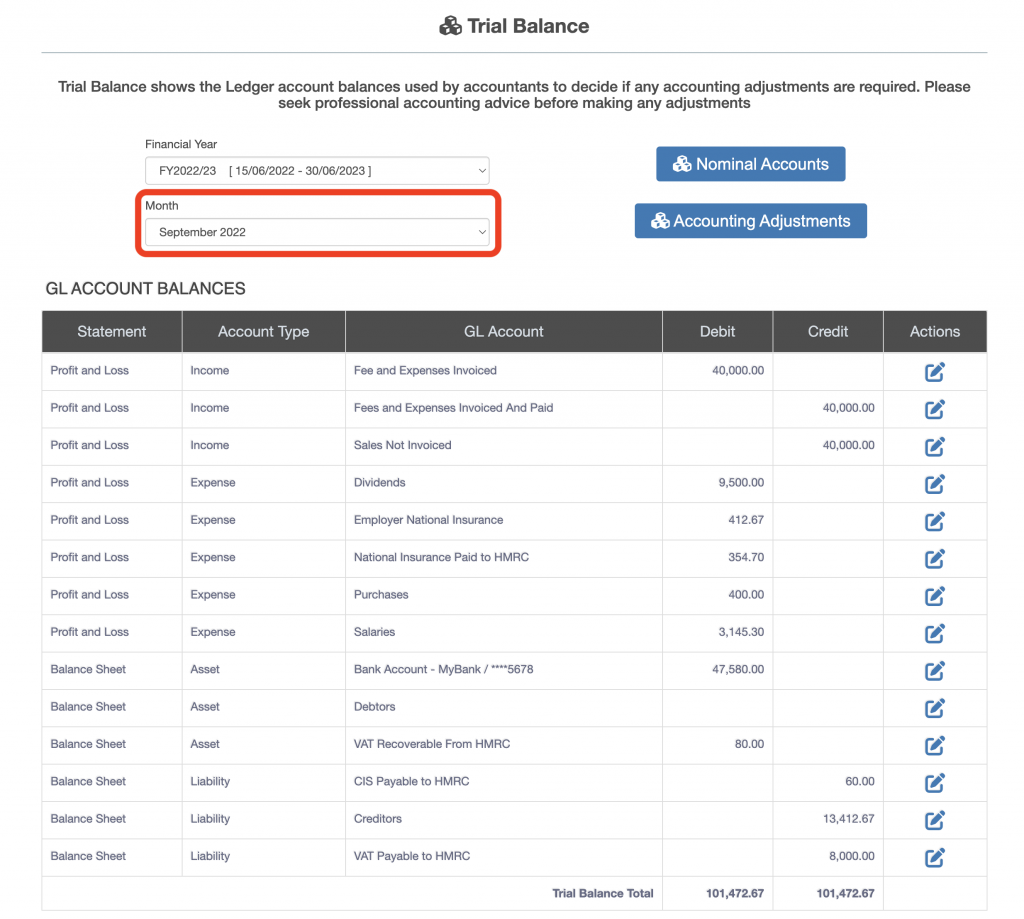 The trial balance for the selected month will be shown, use the “Month” dropdown (circled in red above) to select a month in the financial year.