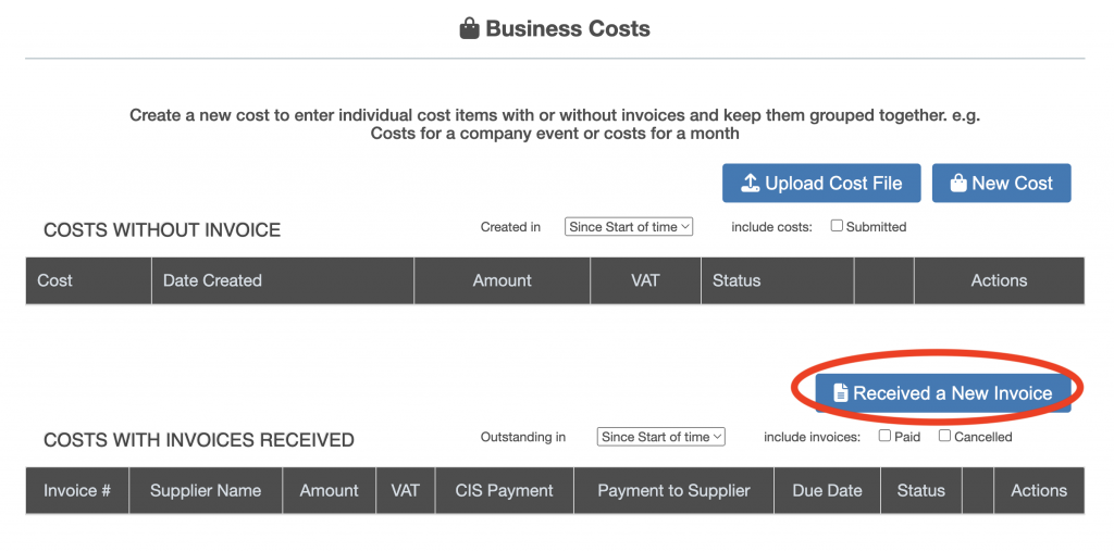 Press the “Received a New Invoice” button on the “Business Costs” screen.