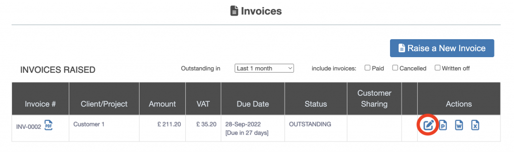 Any invoice which has been shared can be revoked from sharing. To revoke the invoice from invoice sharing, navigate to the invoice and click the view icon (notepad with a pen).