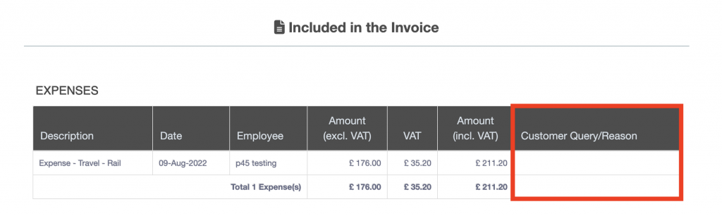 At the bottom of the actions history on the invoice screen all the timesheet hours, sales and expenses included in the invoice are listed. Should a customer add a query to one or more of the items in the invoice the query will be displayed on this screen.