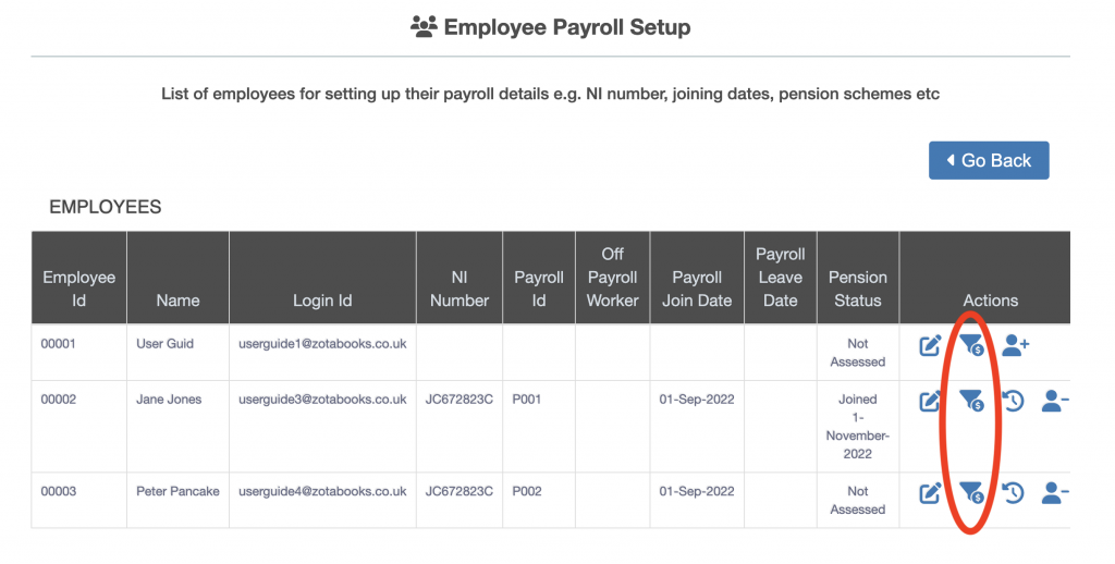 In the “Employee Payroll Setup” screen (click here to learn how to access the Employee Payroll Setup” screen) click the “Pension Enrolments” icon (circled in red below).