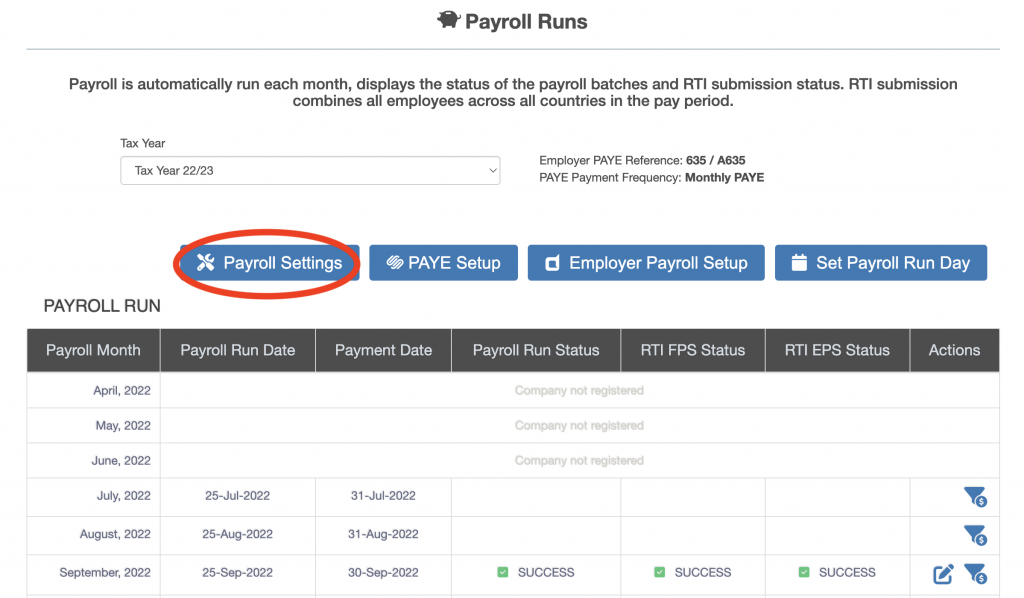 From the left hand menu select “Payroll”. The “Payroll Runs” screen will appear. Press the “Payroll Settings” button.