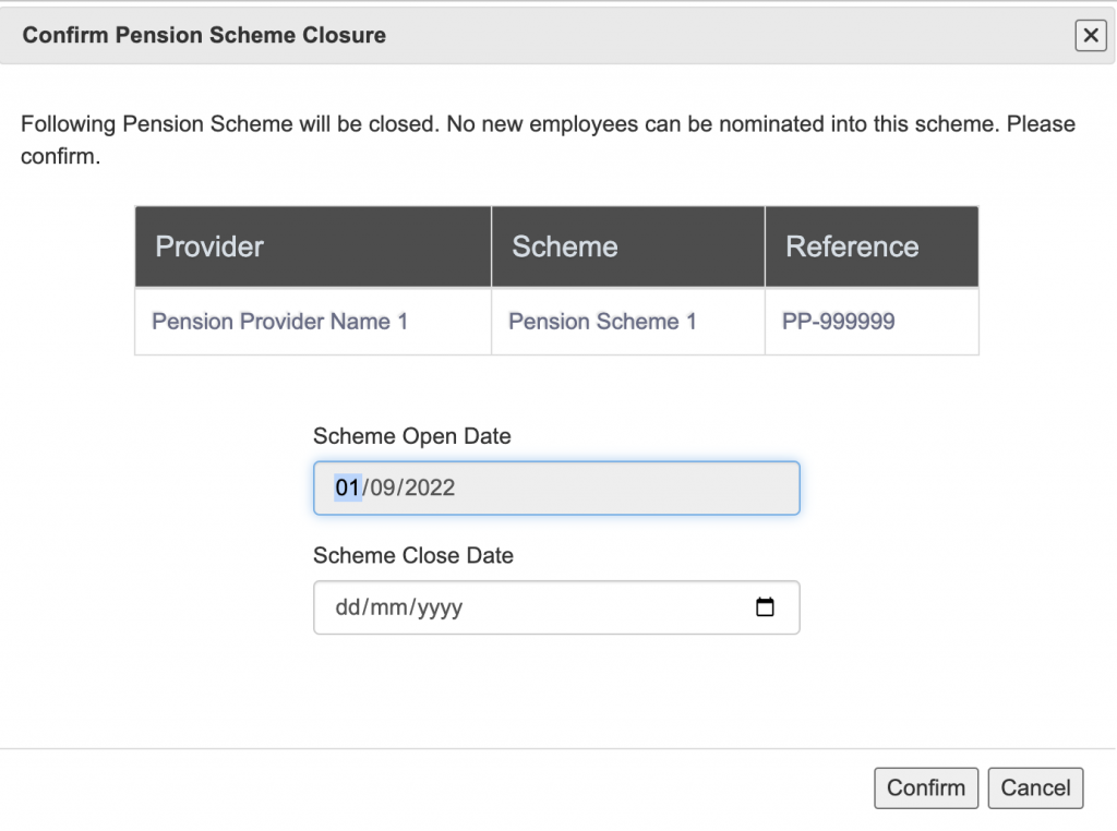 Select the date from which the pension scheme will close to new employees, then press the “Confirm” button. The list of pension schemes will be displayed, the pension scheme which has closed will have a change in its “Scheme Status” to say “Closed on ” a specific date.