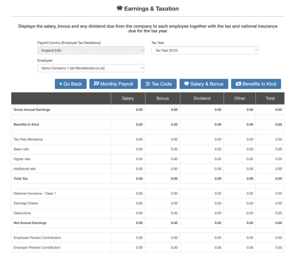 The employee earnings and taxation screen (shown below) shows the latest salary, bonus and benefits summary of tax for the selected financial year.