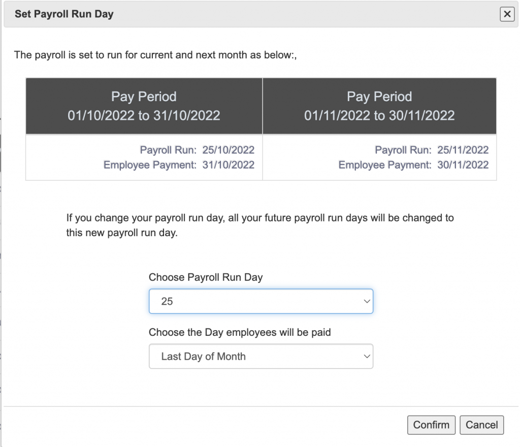 To change the day the payroll is run, select a day of the month from the “Choose Payroll Run Day” and press the “Confirm” button.