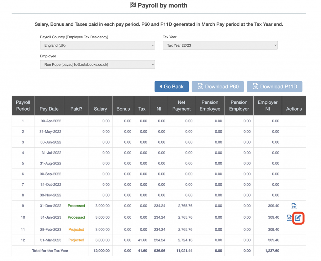 The latest month has an icon which shows allows the payroll amounts to be edited (outlined in red below), this is only available before accounting entries are made to the ledger (click here to learn how to reverse payroll accounting entries to enable changes to be made).