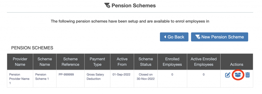 A closed pension scheme can be re-opened by selecting the “Re-open” icon under Actions (circled in red below).