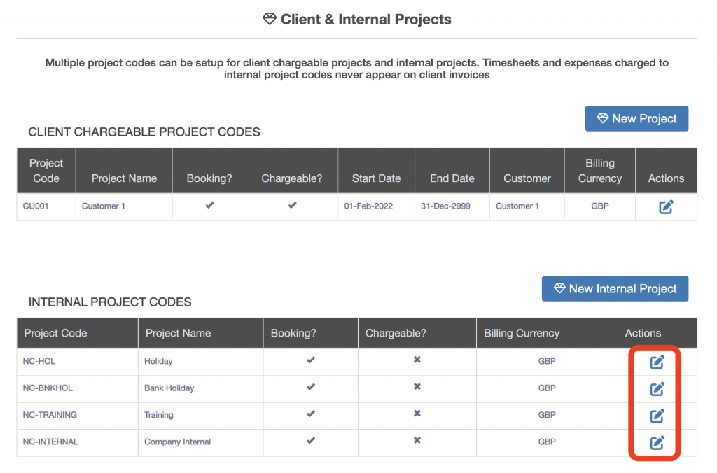 From the left hand menu select “Project Setup”. The “Project Setup” screen is displayed. Under the header “Internal Project Codes” select click the edit icon under the Actions heading (outlined in red below).