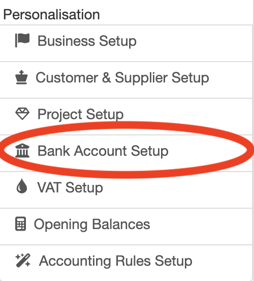 A new bank account is added by selecting the “Bank Account Setup” from the left hand menu under “Personalisation”.
