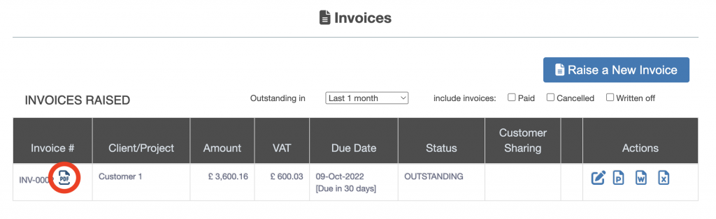 From the left hand menu select “Raise Invoice”. The “Raise Invoice” screen is displayed. Click on the PDF icon to the right of a number invoice.