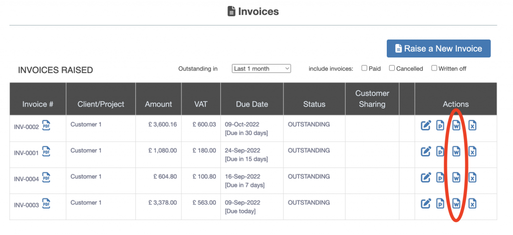 From the left hand menu select “Raise Invoice”. The “Raise Invoice” screen is displayed. Click on the write-off icon under the Actions heading for the invoice to be cancelled (file with an W circled below in red).