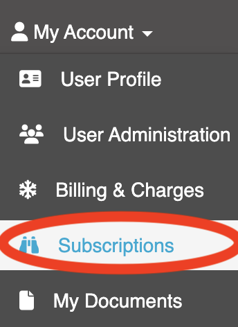 To subscribe to HMRC RTI go to the “My Account” menu at the top right hand side of the screen, select “Subscription” from the menu (see below).