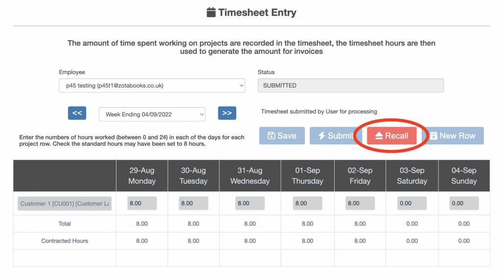 Press the “Recall” button to withdraw the weeks timesheet from submission.