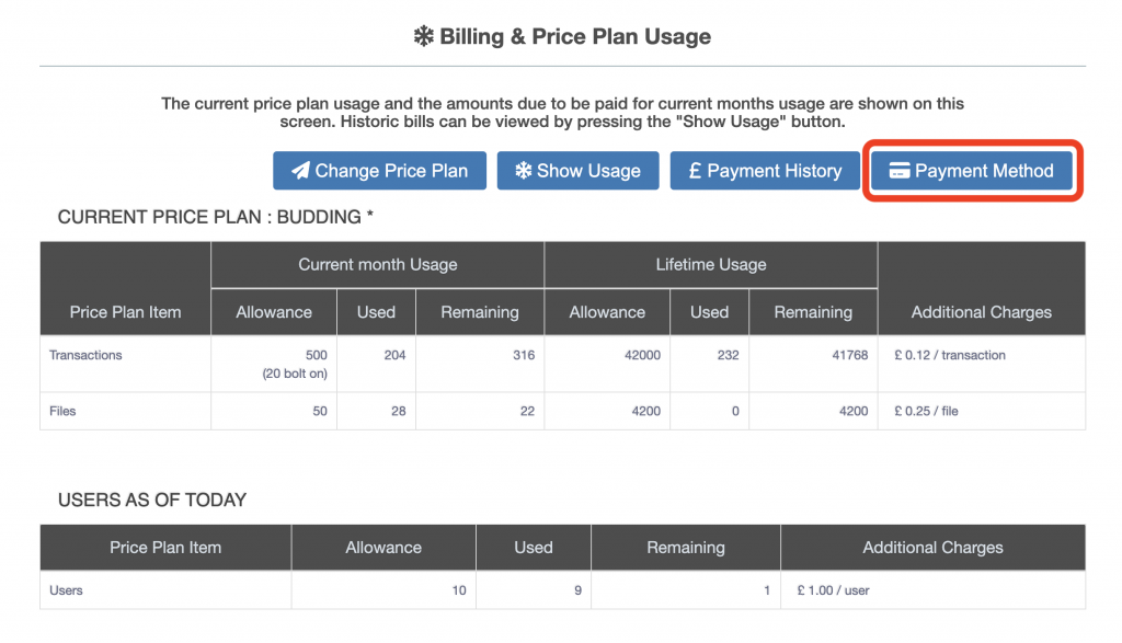 Press the “Payment Method” button (outlined in red below), the payment methods screen is displayed which shows all previous and current payment methods setup in ZotaBooks. ZotaBooks does not store your payment details, this information is held and managed by Braintree (A Paypal company).