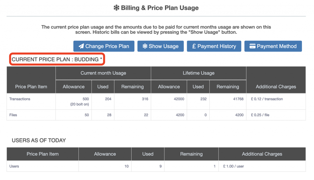 Select MyAccount -> Billing & Charges, the Billing & Price Plan Usage screen is displayed. The current price plan is show above the first table (outlined below in red).